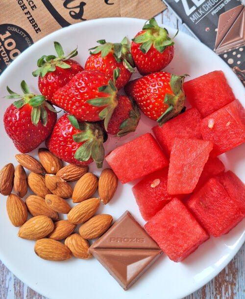 Ingredienti: 160 g frutta fresca, 20 g di mandorle della California Prozis, 1 quadratino di cioccolato senza zucchero Prozis.